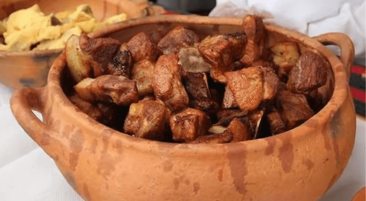 8. Couennes de porc en alpaga : Une option saine en raison de sa faible teneur en matières grasses. La viande est cuite jusqu’à épuisement de l’eau, puis elle est frite dans sa propre graisse. Il est accompagné d’une chaîne de montagnes, de pommes de terre et de chuño.