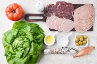 Ensuite, nous répartissons les saucisses sélectionnées sur la salade. Dans notre cas, 50 gr taureau blanc50 ans taureau noir50 g de catalan, un morceau de fut fin et 1 cuillère à soupe d’olives au goût.